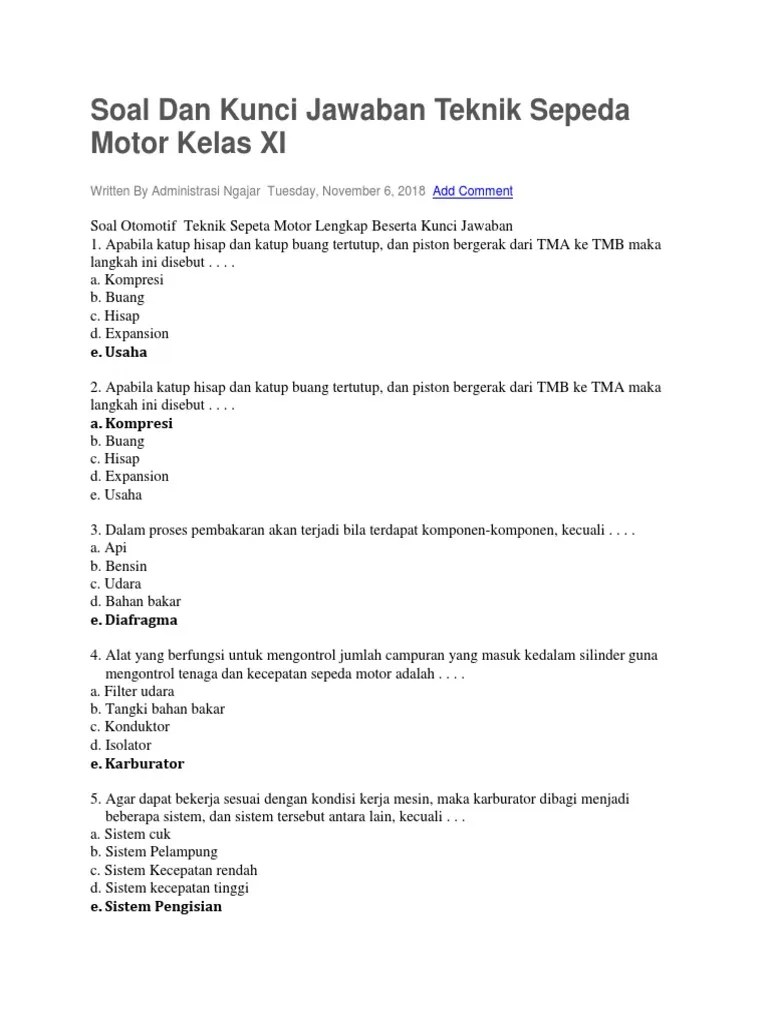 Play this game to review professional development. Contoh soal essay pdto kelas 10 semester 2. Berikut ini yang bukan bagian utama dari multi tester yaitu …. Soal pts teknik sepeda motor (tsm) kelas x semester 1 (ganjil) tahun 2020soal pts teknik . Selamat datang sobat smk, pada artikel ini admin akan berbagi tentang soal uas produktif tsm dan tkr.